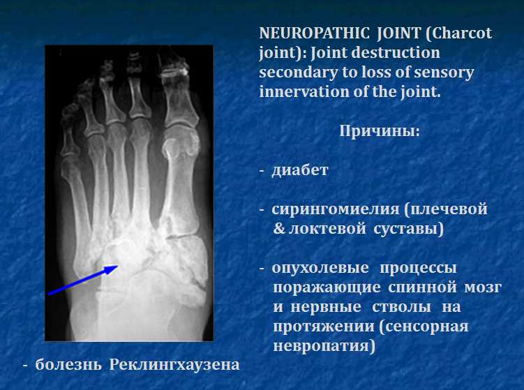 Причины:диабет, сирингомиелия (плечевой & локтевой суставы),опухолевые процессы поражающие спинной мозг и нервные стволы на протяжении (сенсорная невропатия), болезнь Реклингхаузена). Возможно в тему. Кроме того необходмо учесть возможность ССА - серонегативный спондилеартрит.
