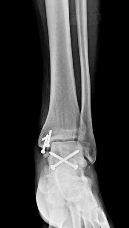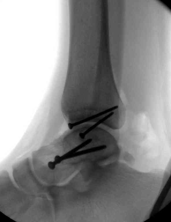 Обычно используется доступ с остетомией внутренней лодыжки, но у вашей пациентки есть перелом лодыжки что можно использовать для доступа к таранной кости и в конце операции зафиксировать перелом лодыжки. К сожалению нет