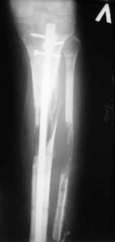 К сожалению, ни в одном из этих 3-х случаев мы не получили удовлетворяющего нас результата. Очень трудно провести штифт, введенный антеградно ровно по центру таранной кости. Отсутствие подвижности между диафизом и дистальным отломком большеберцовой кости (после фиксации в аппарате в течение 1-2 мес) очень усложняет проведение штифта в центр блока таранной кости. Поэтому мы от этого пока отказались, и проводим штифт через пятку. При данном варианте фиксации подобных проблем не возникало ни разу.