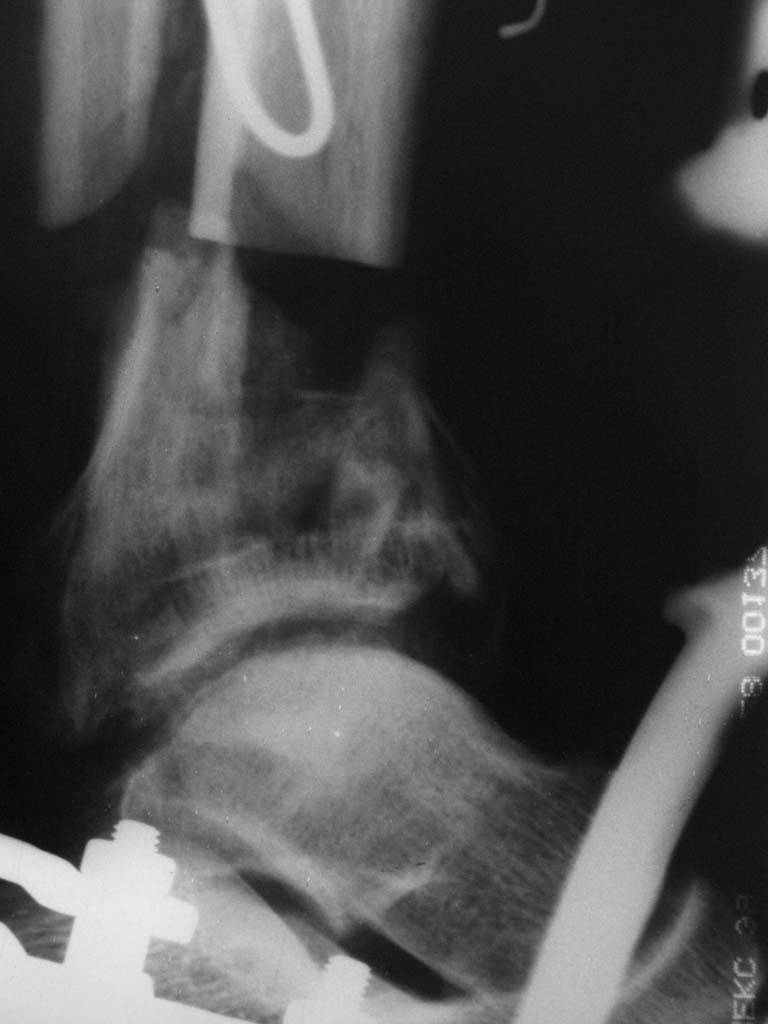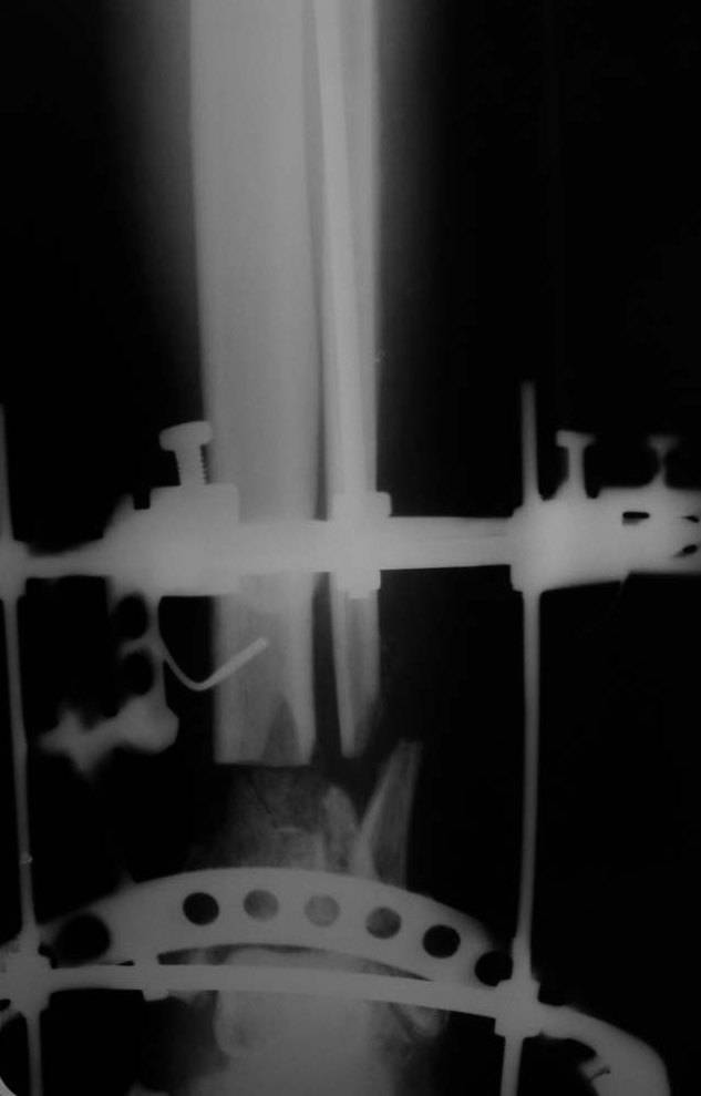 В случае гладкого заживления раны, при условии положительного решения вопроса с металлом, планируем перемонтаж аппарата Илизарова, дополнительную резекцию дистального отломка, выведение полокости голеностопного сустава в правильное положение (см. боковую Р-грамму), одномоментно остеотомия большеберцовой кости. После восстановления длинны голени, по всей видимости, артродез голеностопного сустава.