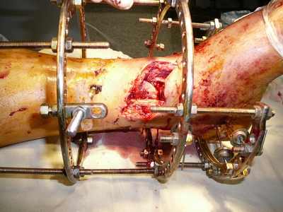 Больному выполнена резекция малоберцовой кости, ВХО раны, сближение отломков. Резекция м\б через отдельный разрез. После ВХО компрессия в аппарате, края раны сближены наводящими швами (без натяжения).