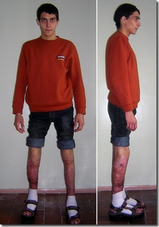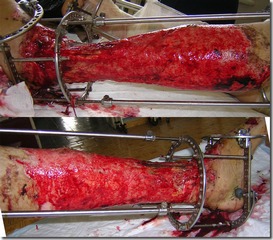 На представленных Вами фотографиях, по моему мнению, у пациента ожоги II-IIIАБ степени. Мне кажется не стоит думать о сращении кости до полного заживления покровных тканей. Позвольте представить наш клинический пример с подобной комбинированной травмой (см. приложение).
