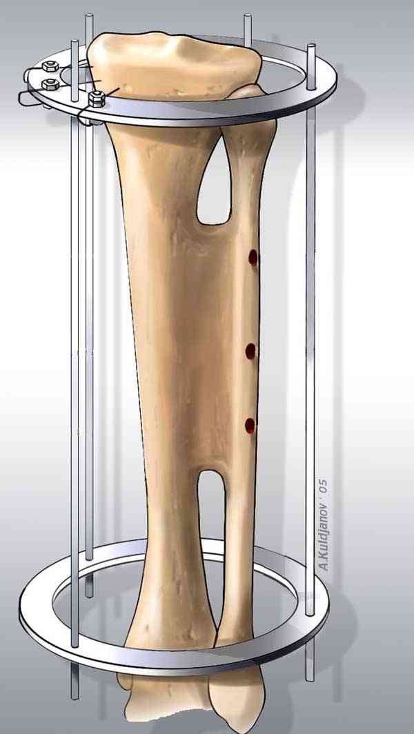 Недостаток костной массы можно заместить расширением малоберцовой. На небольшое расстояние можно передвинуть медиальный кортекс малоберцовой в аппарате. Отрицательным моментом техники является продольная остеотомия малоберцовой.