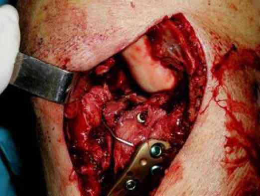 Для метадиафизарной части этого повреждения обнажение перелома с анатомичной репозицией не является абсолютно необходимым, и, более того, неизбежно приведёт к деваскуляризации кости и возможным проблемам с заживлением перелома. Для этой части перелома желательно шинирование без обнажения зоны перелома. Шинирование может быть интрамедуллярным соответствующим гвоздём или экстрамедуллярным (пластиной или аппаратом внешней фиксации). Главное для метадиафизарной части перелома - это восстановление длины, оси конечности с правильной ротационной установкой и достижением относительной стабильности.
