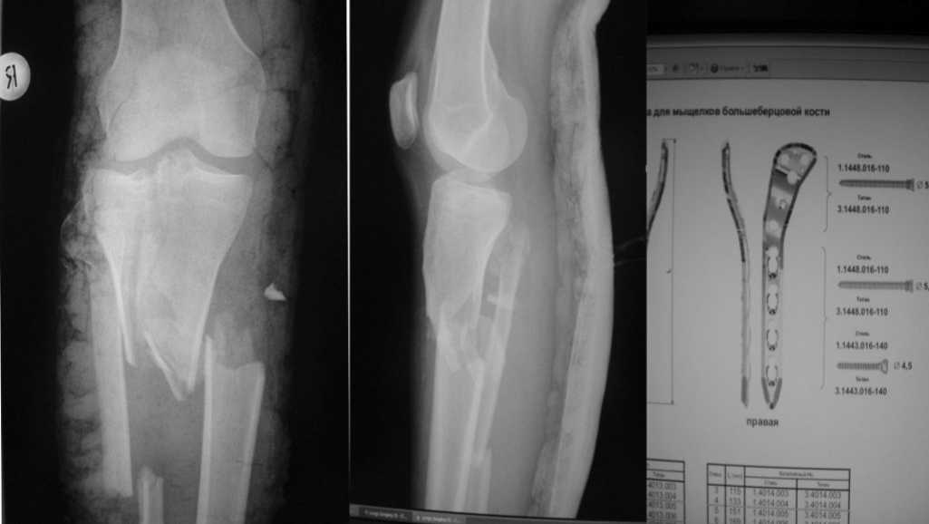 Закрытый перелом проксимального конца правой голени. (см снимки). Из сопутствующих: перелом правого луча в т.м. без смещения. ЗЧМТ. Ушиб головного мозга, субарахноидальное кровоизлияние. Левосторонний гемипарез. Неосложненный перелом 3-4 ребер справа.