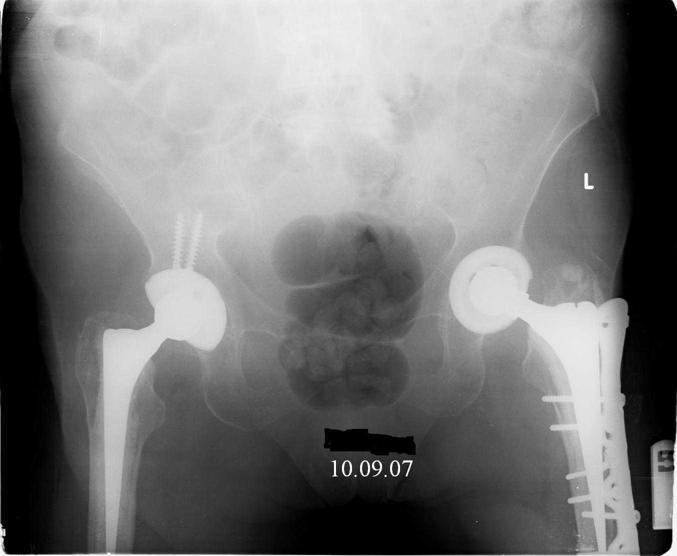 Female, rheumatoid, THA in 2003, car accident in 2006, failed plating. Nailing in Oct 2007. The nail is solid with hollow proximal part where the stem is docked. Last images are in 1 year after