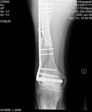 Теперь ситуация более ясная. Оптимальным тут, очевидно, было бы малоинвазивное удаление пластины и закрытый интрамедуллярный остеосинтез длинной гаммой или другим проксимальным гвоздем. Это не только обеспечило бы надежную фиксацию всех проблемных отделов бедра, но и позволило бы немедленную полную нагрузку.