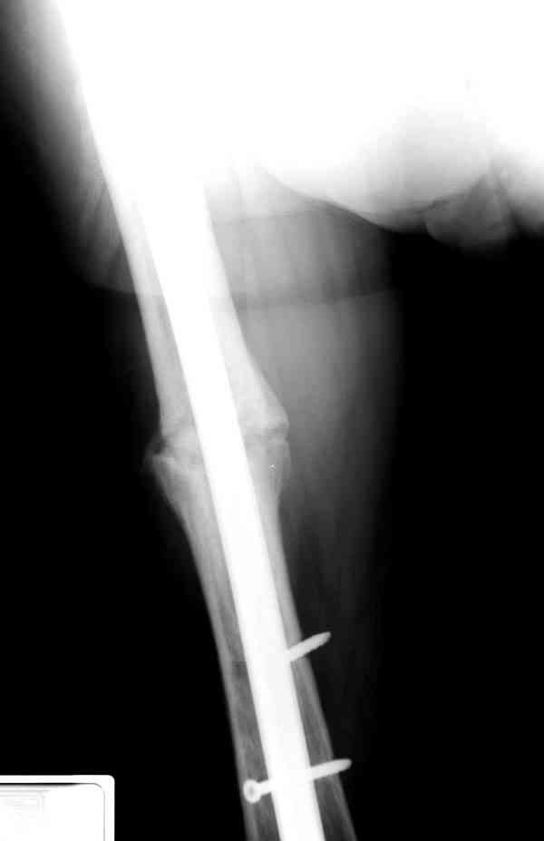 Сросшаяся малоберцовая как распорка привела к образованию ложного сустава. В таких случаях удаляем сломанный штифт и проводим стимуляцию ложного сустава рассверливанием. Рассверливание канала создает стимуляцию на месте ложного сустава, и динамический вариант блокировки штифта с большим диаметром создаст стабильность. Ранняя нагрузка после остеотомии малоберцовой приведет к сращению ложного сустава.