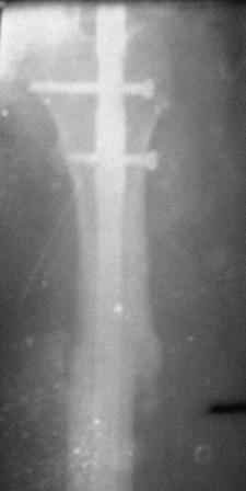 12.02.09г б-ная оперирована: з/остеоклазия (без особого труда- видимо тугой ложный сустав) коррекция деформации, удаление штифта из надвертельной обл, рассверливание канала гибкими развертками, реостеосинтез блокируюшим гвоздем Д-11мм.
