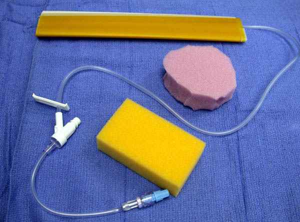 И правда, было! Губку дествительно используем ту, которая входит в упавку штифтов Expert от Synthes, но думаю подойдет и из хозмага (та, что для мытья посуды, по 10 р) и со строительного рынка.. Стерилизуем в автоклаве... Вырезаем по форме раны непосредственно на операции. Дренажная трубка не должна касаться тканей, ее следует укладывать между двумя слоями поролона.. Отсуда поролон должен быть толщиной 1-1,5 см, не больше... Пленки типа ИОБАН от 3М, плюс дополняем герметичность обычной пленкой для пищевых прдуктов..тоненькая такая в магазинах, как сопутствующий товар продается..