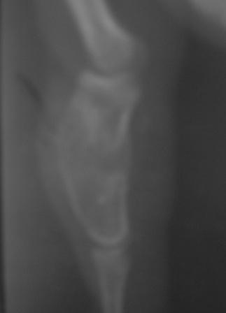 20.03.09г. операция. Экскохлеация не получилось, стенки диафиза фаланги как папиросная бумага, хотел сохранить хоть одну стенку, но и это не получилось - ломается и крошится, удалось сохранить оба эпифиза, проксимально чуть стенку и метафиза. В полости белесоватая кашицеобразная масса. Дефект заполнен сформированной под фалангу аутопластикой из гребня подвздошной кости, сверху ушита надкостницей, пальцевые сосуды сохранены. Материал отправлен на гистологию. Фикация спицей трансартикулярно, вынужденно фиксировали оба сустава - но это мне никак не нравится!
