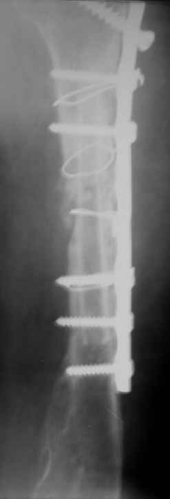 Уважаемые коллеги! На консультации больная 65 лет. С одной рентгенограммой - рис.1. Анамнез: 30 августа перелом левой плечевой кости, невропатия лучевого нерва - кисть повисла сразу. Лечение по месту жительства - иммобилизация косынкой. 2 октября в одной из больниц города металлоостеосинтез. Все развалилось. 16 октября - повторная операция, через десять дней - картина на рис.1. Далее металлоостеосинтез с костной аутопластикой малоберцовой костью 9 февраля 2009г. Снимки 2-4 выполнены сегодня. Считаем, что шансов на приживление и перестройку такого трансплантата в данной ситуации нет. Нестабильность запрограммирована и вываливание этого всего дело ближайшего будущего.Вопросы для обсуждения: 1. Кто-нибудь считает, что надо оставить "как есть"? Аргументы? 2. Если оперировать, то что выбрать: - фиксация пластиной с угловой стабильностью с ревизией нерва; - блокированный остеосинтез; 3. Что делать с трансплантатом - удалить - измельчить и оставить - не трогать, попытаться "нанизать" на гвоздь закрыто. Юрий Алексеевич Булахтин