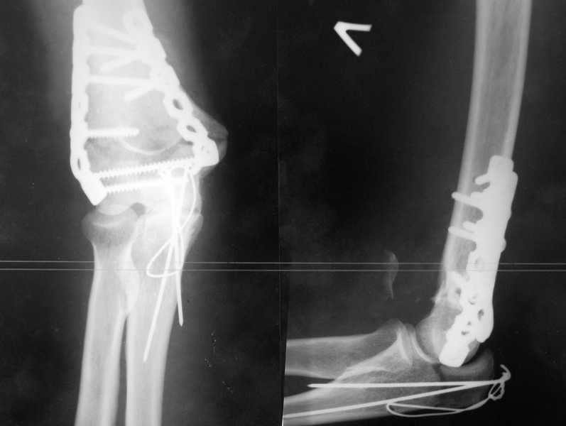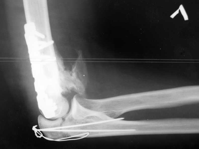 У пациентки 42 лет после операции остеосинтеза чрезмыщелкового перелома плеча, выполненной в нашей клинике 2 месяца назад, на контрольных R-граммах имеется гетеротопический оссификат по передней поверхности плеча. Оперирована по методике АО, после операции максимально рано начала заниматся ЛФК. В настоящее время основная жалоба пациентки на ограничение сгибания в локтевом суставе. Клинически объем движений: сгибание 90 градусов, разгибание 170 градусов, ротационные движения в полном объеме. Привожу снимки сразу после операции и через 2 месяца. (На рентгенограммах после операции в мягких тканях по передней поверхности плеча имеется небольшой костный фрагмент, но его ширина во фронтальной плоскости не более 1 мм., обнаружен был по снимкам после операции. Интраоперационно основные крупные фрагменты отрепонировались хорошо, объем движений был сгибание до 75 градусов, разгибание 175 град.) Пациентка неудовлетворена объемом сгибания, хотя была предупреждена о высокой вероятности ограничения движений. Профилактика гетеротопической оссификации (прием индометацина) не проводилась, т.к. имелась язвенная болезнь, да и эффект от его приема считаю сомнительным. Вопросы: 1.Стоит ли вмешиваться и пытаться удалить экзостоз? Если да,то в какие сроки и каким доступом лучше идти? 2. Оставить все как есть? 3. Не поможет ли ударно-волновая терапия либо какая-то другая методика? Буду благодарен за все ответы и оценки своей работы. С таким осложнением столкнулся впервые.