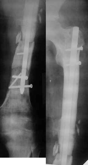 Неудачный остеосинтез пластиной: поломка винтов, миграция фиксатора. После удаления пластины сформировался гипопластический ложный сустав нижней трети бедренной кости, укорочение н/к 5 см. Выполнялся дистакционный остеосинтез аппратом Илизарова на штифте. Зона ложного сустава "не открывалась". Через 10 месяцев, когда даже регенерат полностью перестроился, консолидации в зоне ложного сустава не наступило, несмотря на стабильную фиксацию и постоянную компрессию(штифт+аппрата на 4 кольцах).
