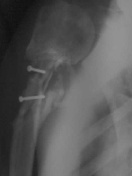 Более года назад пациент был оперирован в одном из НИИТО. При контрольном осмотре через год: болевой синдром, контрактура в локтевом суставе, патолгическая подвижность нижней трети плеча