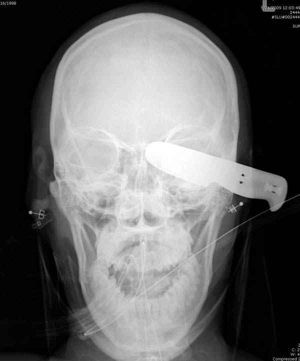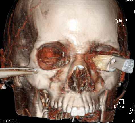 Уважаемые коллеги,Основную массу ургентной травмы в крупных городах Америки оказывают в центрах Травмы Первого Уровня. Ну не так как в популярных телесериалах типа "Emergency Room", но общая атмосфера похожая, где кроме травмы скелета принимаются все остальные ургентные случаи. В своих выступлениях я рассказывал, что наши центры в мирное время по пенетрирующим травмам не уступает Ираку или Афганстану, и вот недавно к нам поступила больная 22 лет, травма "ножом в глаз" от бывшей подруги нынешнего "бой френда". При поступлении в сознании, жаловалась на неприятные ощущения в глазнице. По протоколу сделаны все необходимые исследования: рентген, ангиограмма с 3Д реконструкцией, где обнаружили что все жизненно важные сосуды не задеты, даже некоторые "сидят" изгибаясь на ноже. Одним махом нож удалить не удалось, пришлось раскачать и потом двумя руками удалили нож. Рана без кровотечения, обработана и зашита.
