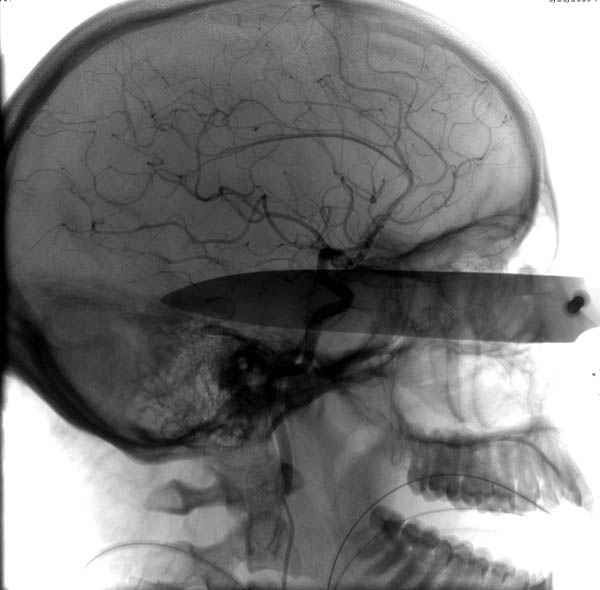 Отличный пример современного подхода к проблеме.Проиллюстрированы все технические и материальные возможности, которые позволили врачам безопасно удалить нож.30 лет назад был подобный случай - доставлен пациент с ножом в правой височной области, в проекции a.meningea media,длина лезвия до 6 см.Мнения молодых врачей разделились, от простого удаления ножа в операционной до трепанационной ревизии височной зоны.Заведующий отделением просто выдернул нож в перевязочной, назначил ПСС и пенициллин.Через 7 дней пациент без дефекта был выписан.