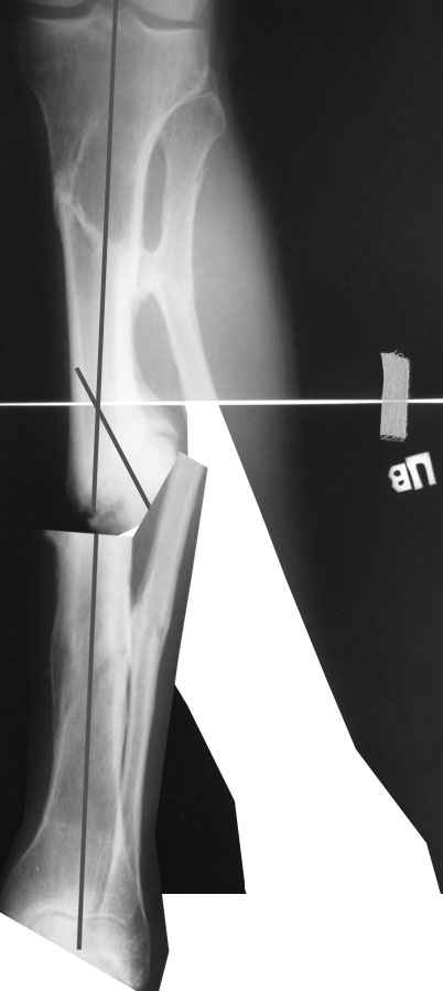 Мы бы сделали после остеотомии малоберцовой и аппаратной коррекции. Большеберцовую можно исправить за счет растяжения пседартроза. Можно и сделать поперечную остеотомию чуть дистальнее несращения, в этом случае будет удобный вход в периферический отломок. А зону несращения пройти разверткой просто по прямой. Схема в приложении.