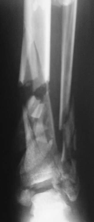 Уважаемые коллеги, на обсуждение представляем следующий клинический случай. Пациент, 22 года, травму получил в результате ДТП (управление мотоциклом). Имеет место открытый оскольчатый перелом костей левой голени в нижней трети.Хотелось бы узнать Ваши мнения по лечению данного пациента.