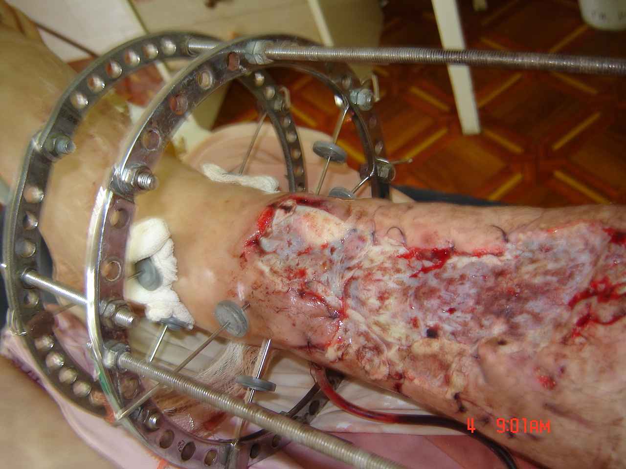 Пациент 42 лет около 3-х месяцев лечился на районе с открытым двойным переломом большеберцовой кости на границе верхней и средней трети и на границе нижней и средней трети,двойным переломом малоберцовой кости. Прооперирован на районе в день поступления- произведен остеосинтез перелома большеберцовой кости металической пластиной. В послеоперационном периоде некроз краёв раны по передней поверхности голени, нагноение, остеомиелит. Была попытка свести края раны путём нанесения послабляющих разрезов по боковым поверхностям голени.При поступлении в наш центр у пациента обширная рана передней поверхности голени с дефектом мягких тканей, в ране на большом протяжении обнажена нежизнеспособная тусклая большеберцовая кость, в том числе зона перелома. Отделяемое из раны гнойное с неприятным запахом. На операции после резекции осцилирующей пилой передней поверхности обнажённой части большеберцовой кости, в костно-мозговом канале большое количество гноя, задняя поверхность большеберцовой кости тусклая. Некрэктомия и остеосеквестрэктомия, из костно-мозговых каналов оставшихся верхнего и нижнего отрезков большеберцовой кости умеренное кровотечение. Произведена транспозиция мышечного лоскута передней большеберцовой мышцы на ветвях передней большеберцовой артерии в область ложа большеберцовой кости, мышцей закрыты верхний и нижний отрезки большеберцовой кости. На мышечное ложе уложены свободные расщеплённые мышечные лоскуты, взятые с правого бедра. Произведен стабилизирующий остеосинтез правой голени спицами,фиксированными и натянутыми в аппарате Иллизарова. В послеоперационном периоде лоскуты хорошо фиксированы, рана чистая, по дренажам скудное отделяемое геморрагического характера. Дренаж сегодня удалил. Планируется после полного востановления кожного покрова и консолидации перелома малоберцовой кости, транспозиция и фиксация последней на область дефекта большеберцовой кости. Одномоментно побоялись сделать такую оперцию из-за риска развития остеомиелита малоберцовой кости, так как оперировали на фоне выраженных гнойных осложнений.Фото прилагаю.С уважением, Цветков Евгений.