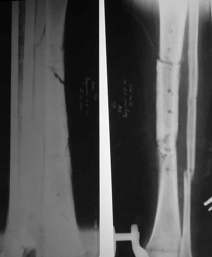 Существует вариант отщепа малоберцовой кости и перемещение его в дефект большеберцовой. Но он технически непрост, надо через отдельные разрезы отсечь малоберцовую кость на всю длину дефекта. Да еще в условиях инфекции! Правда, можно присмотреться к варианту двойной остеотомии малоберцовой кости на уровне концов отломков большеберцовой и дозированного перемещения ее в дефект. Личного опыта по двум последним вариантам у меня нет, советовать сложно. Хотя расчет показывает, что сроки заметно сократятся: после остеотомии перемещать малоберцовую надо сантиметра на 4 (5+40 дней) и на консолидацию около 60-90 дней.