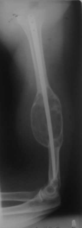 Уважаемые коллеги! 3 года назад оперирована пациентка по поводу патологического перелома плеча на фоне костной кисты. Выполнен ЗИО плоским титановым стержнем. Спустя 1,5 года на фоне сросшегося перелома выявлен рост опухоли, подозрение на малигнизацию. Консультирована онкологами, те пациентку своей не признали, биопсия не проводилась. Биопсия выполнена в июне 2009, по заключению одного учреждения - костная киста, по другому - хондросаркома. Обследована, отдаленных метастазов нет. Вопросы: Диагноз? Варианты лечения? Может резекция в пределах здоровой кости, каркасная металлопластика плюс гвоздь? Спасибо.