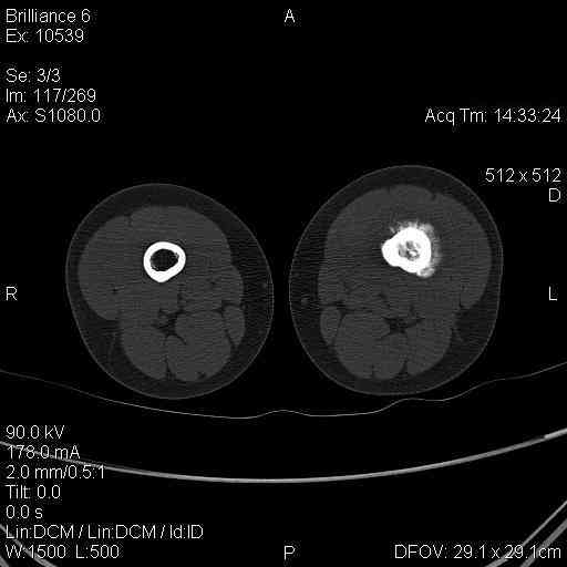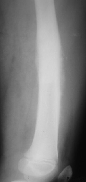 Судя по представленным снимкам, нужно подумать о саркоме Юинга, так как Остеогенная саркома редко поражает диафиз трубчатых костей. Ее излюбленно место - метаэпифиз.