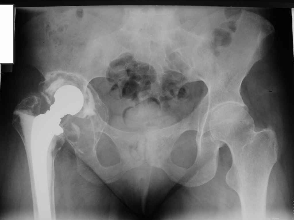 An.morbi: В 1991 г.ДТП, получила ушиб правого тазобедренного сустава, после чего стали беспокоить периодические боли в правом тазобедренном сустав при нагрузке. В 1992 г. Госпитализирована в ГВКГ им. Бурденко с артрозо — артритом правого тазобедренного сустава, предположительно туберкулезной этиологии, в течение года получала спецефическую терапию (стрептомицин, тубазид, рифацин, канамицин, пиразинамид) Туберкулезный процесс перешел в стадию затихания с формированием метатуберкулезного фиброзного анкилоза, БК- (минус). В 1993 г эндопротезирование правого тазобедренного сустава цементным эндопротезом Мовшовича. Послеоперационный период протекал гладко, получала курс восстановительной терапии. В 2004 г. снята с учета в туберкулезном диспансере. В конце 2004 года появились периодические боли в правом тазобедренном суставе при физической нагрузке. С 2005 г. ходит с тростью. Рентгенограммы от 07,07,2009г. Данных за нестабильность ножки не выявлено. Помогите определиться с выбором оптимального варианта ревизии: 1 вариант Планируем использовать кольцо Бурх—Шнайдера большого размера 60 (внутренний диаметр) и аллотрансплантат для пластики дна впадины и тела седалищной кости, чтобы получить возможность фиксации нижней клиновидной части кольца и уменьшить размер дефекта. 2 вариант пластика вертлужной впадины массивным аллотрансплантатом с установкой в него цементной чашки. Возможно, будут и другие предложения. Прошу высказать свое мнение коллег, занимающихся ревизионным эндопротезированием