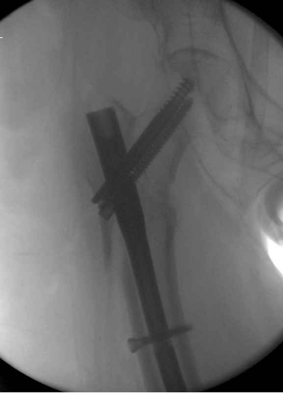 По нашему мнению линия перелома проходит вверху через латеральный отдел шейки бедра, вертельная область состоит из нескольких фрагментов. В таких условиях применить DHS или дистальную бедренную пластину LCP представляется нам сомнительным. Закрытый остеосинтез проксимальным гамма-гвоздем или PFNa невозможен т.к. нет ЭОПа.