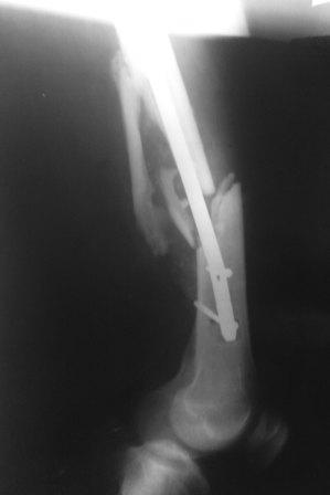 Да, такая картина заставляет план подкорректировать. После удаления стержня надо дистрактором одномоментно или, если не получится, постепенно восстановить длину. И для окончательного устранения антекурвации надо взять гвоздь потолще и подлиннее.
