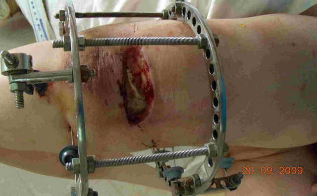 Произведена вторичная гнойная хирургическая обработка раны, стабилизация перелома аппаратом, вакуумное дренирование.