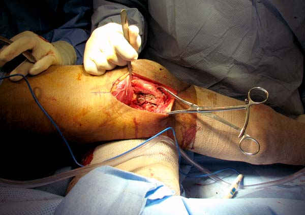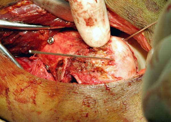 Здесь применен рутинный метод лечения огнестрельных переломов, т.е. рана теоретически чистая, что противоречит принятым ранее догмам . По принятой тактике, при огнестрельных переломах назначаются антибиотики Ancef 1gm каждые 8 часов внутривенно в течение 24 часов. Желательно первую дозу ввести непосредственно перед разрезом.