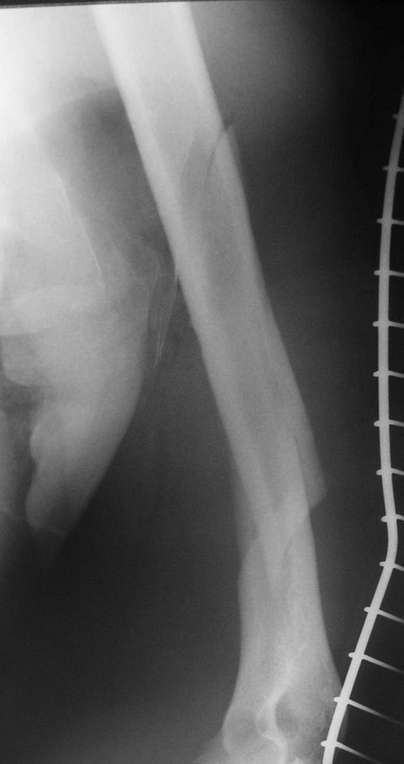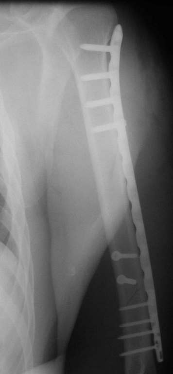 Позвольте привести пример из собственной московской практики в поддержку тактики, приведенной в данном примере. Пациент переведен из одной из московских клиник на 3 сутки после сквозного огнестрельного ранения плеча(пистолет)с ушитыми узловыми швами и дренированными резиновым выпускником ранами на внутренней поверхности плеча с умеренным серозногнойным отделяемым и похожей раной на задненаружной поверхности грудной клетки (пуля прошла через плечо и остановилась в мышцах спины). Также имелись реактивный локтевой бурсит и нейропатия локтевого нерва. При поступлении были сняты швы, начата антибиотикотерапия. Через сутки после травмы пациент прооперирован: выполнена повторная хирургическая обработка ран плеча и грудной клетки. Через отдельные доступы на наружной поверхности плеча произведен минимально инвазивный остеосинтез плечевой кости блокируемой метадиафизарной пластиной. Пациент выписан на 4 сутки после операции. Дальнейшее течение гладкое, все раны зажили первичным натяжением. Еще раз пациент был госпитализирован через 4 месяца после операции с переломом этого же плеча на границе средней и дистальной третей: коллеги по криминальному ремеслу применили к нему слишком жесткие меры убеждения. Выполнен остеосинтез путем замены и добавления винтов в дистальной части пластины. Госпитализация 2 суток. К сожалению, последние снимки не сохранились.