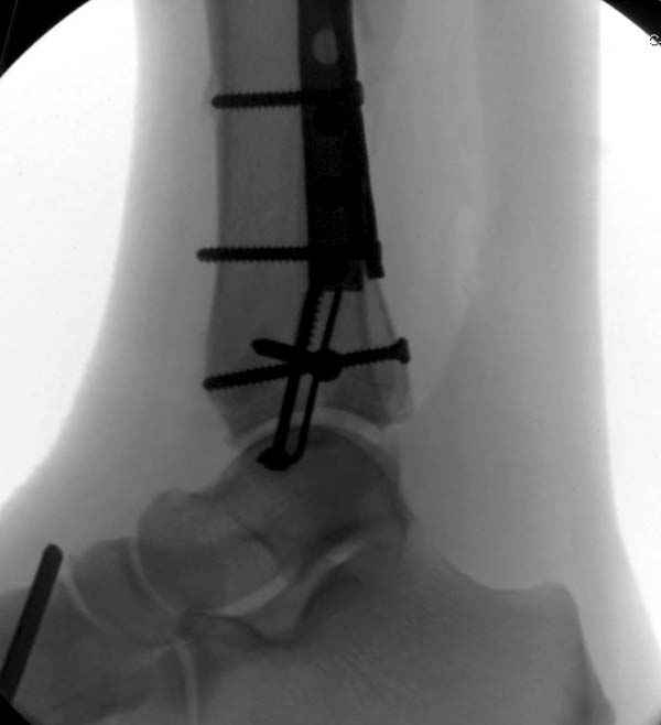 Артродез штифтом от Синтеза - немного агрессивно, а для улучшения качества жизни вместо артродеза голеностопа можно было бы предложить артродез подтаранного сустава. Тремя 6.5 мм каннюлированными шурупами через пятку.