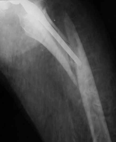 2. Применение ножки дистальной фиксации, мы отдаем предпочтение ножке Вагнера с фиксацией проксимального отдела на ножке. Более травматичное вмешательство, но при стабильной фиксации ножки реабилитация идет в обычном режиме.