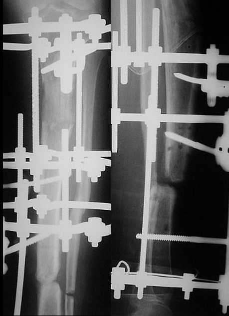 Положение отломков улучшилось. Манипулируя стержнями, в ожидании заживления ран, довправим отломки, попытаемся вывести стопу, насколько успеем. Затем выполним БИОС.