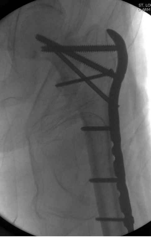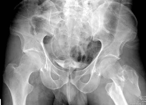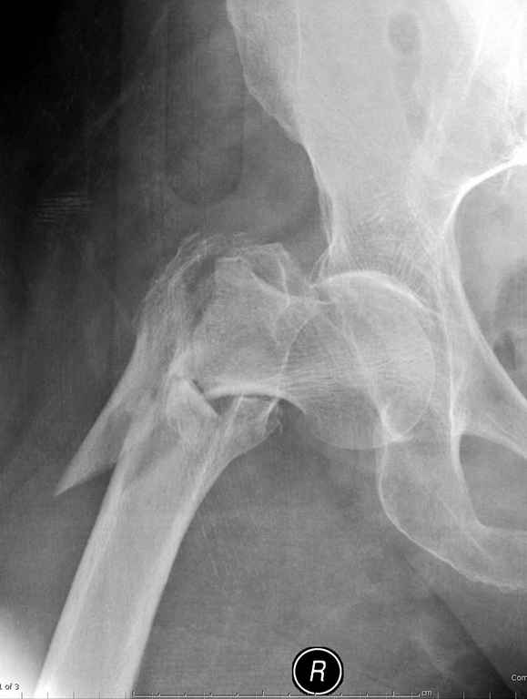 При отсутствии КТ, снимок на вытяжении поможет увидеть общую картину расположения отломков, особенно потенциальные места введения импланта. Риск раскола в этом случае огромный, поэтому больной должен быть дообследован.