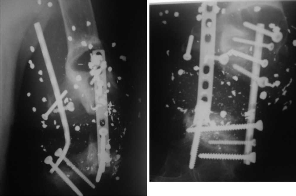 1,5 года проводилось лечение в аппарате внешней фиксации, затем произведена фиксация перелома погружными конструкциями.