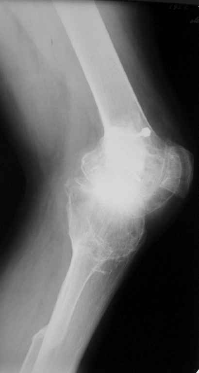 Пациент 59 лет, в 1982 году по поводу остеобластокластомы была выполнена частичная резекция проксимального отдела бедра с пластикой дефекта костно-хрящевым трансплантатом (моноблок)с фиксацией металлическими стяжками. В последующем по поводу деформирующего артроза выполнена корригирущая остеотомия большеберцовой кости. Исход представлен на рентгенограмме. В настоящий момент пациента беспокоят боли в коленном суставе, деформация, и ограничение движений. Варусная деформация коленного сустава 20, движения сгибание 115, разгибание 150, ходит с тростью, выраженная хромота, работа не связана с физическими нагрузками. Правый коленный сустав без патологии. Уважаемые коллеги просим высказать своё мнение - артродез коленного сустава или эндопротезирование.