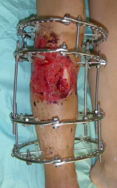Тогда можно рассмотреть вопрос одновременного удаления штифта, мышечной (в данной области применим проксимально отсеченный лоскут камбаловидной мышцы) или микрохирургической (что более надежно) пластики дефекта мягких тканей, остеотомии проксимального фрагмента большеберцовой кости, остеосинтеза блокируемым штифтом с а/б покрытием, наложения простого аппарата Илизарова (можно из полуколец) для дистракции на штифте. При данном варианте пациент сохраняет возможность полной опоры на ногу, что очень важно для заживления у пожилого пациента) и отпадает необходимость в проведении дополнительный операций (при благоприятном развитии событий).