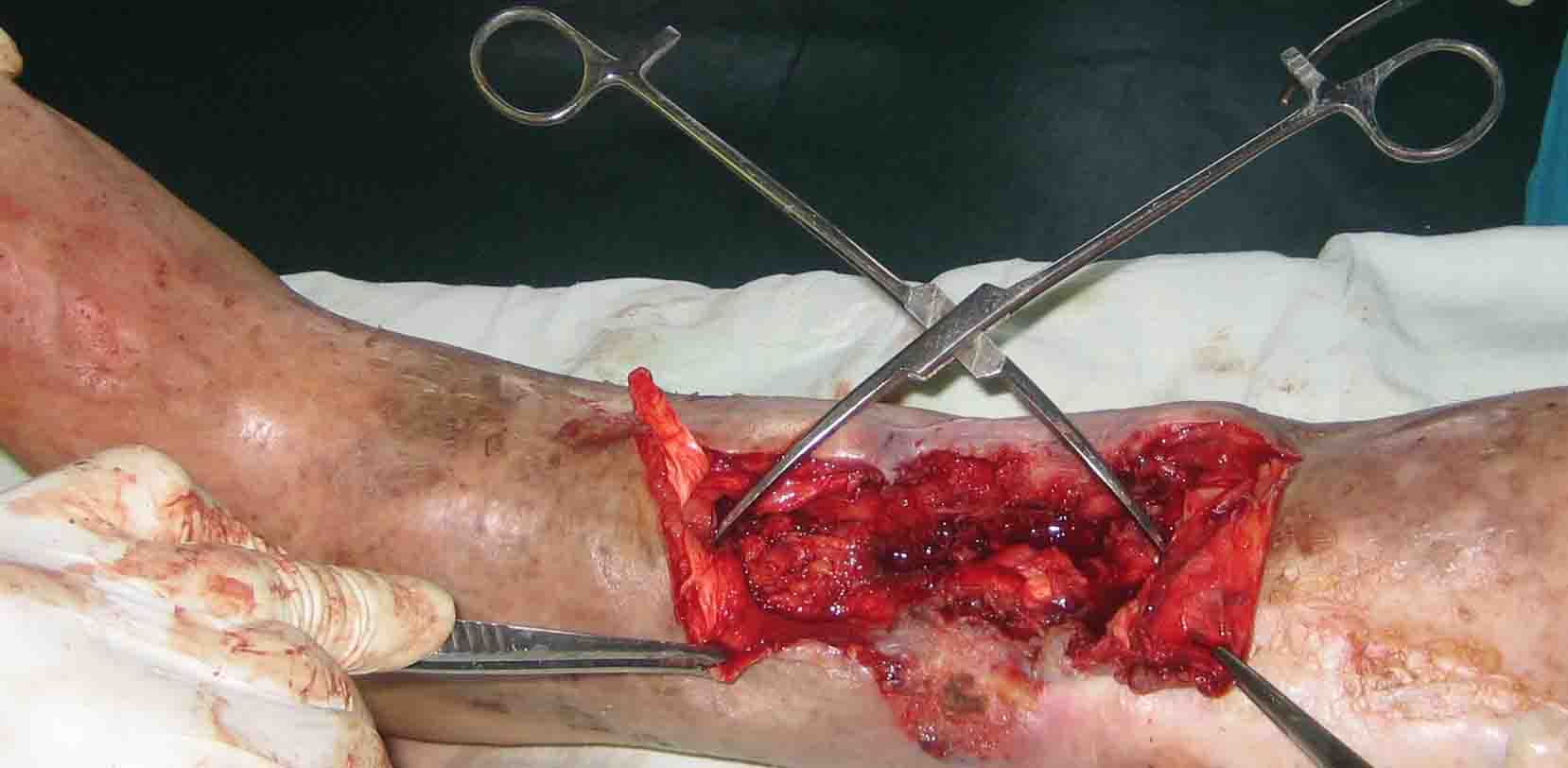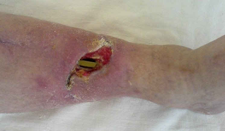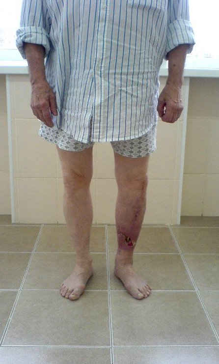 Кратко: мужчина за 60 лет получил травму 28 лет назад (переехало автобусом). Оперировался десятки раз, в итоге с очередным патологическим переломом, хронической язвой и гипсовой лонгетой попал ко мне... Объективно - остеомиелит, инфицированный ложный сустав (или как его назвать), флегмона по наружной поверхности