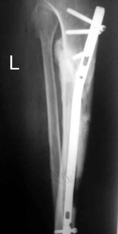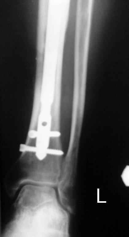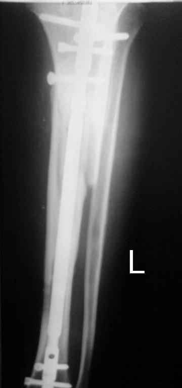 Тогда можно рассмотреть вопрос одновременного удаления штифта, мышечной (в данной области применим проксимально отсеченный лоскут камбаловидной мышцы) или микрохирургической (что более надежно) пластики дефекта мягких тканей, остеотомии проксимального фрагмента большеберцовой кости, остеосинтеза блокируемым штифтом с а/б покрытием, наложения простого аппарата Илизарова (можно из полуколец) для дистракции на штифте. При данном варианте пациент сохраняет возможность полной опоры на ногу, что очень важно для заживления у пожилого пациента) и отпадает необходимость в проведении дополнительный операций (при благоприятном развитии событий).