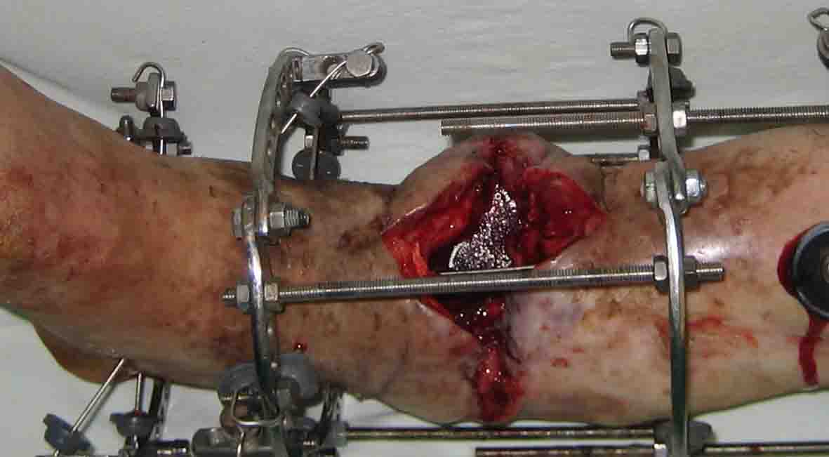 Итак, в настоящий момент больной пришел к нам с полной нагрузкой на оперированную конечность и с такой картиной (см. приложение). Участок мягких тканей с передней стенкой нижней трети ББК, выгнил и представляет дефект 2×2,5 см. На перевязке - циркулярный(?) некроз костной трубки.