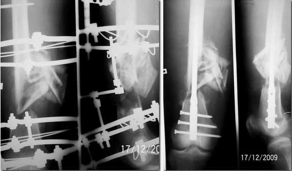 С учетом времени после травмы, течения открытого перелома и немаловажное то, что пациенту после ЧКДО в 90% обеспечена потеря функции коленного сустава поэтому в данном клиническом случае оптимально было бы ЗБИОС. По технике операции мое мнение примерно такое же как у А.Н., но мне кажется учитывая короткий дистальный отломок, после предварительного (дистрактором)восстановления длины и оси конечности не обращая внимание на наличие осколоков оптимально будет произвести ретроградный остеосинтез цементным+АБ покрытием. По окончании операции необходимо произвести редресацию коленного сустава, проведенный ретроградно стержень позволяет увеличить стабильность короткого отломка, тем самым способствует раному начатию опорно-двигательной функции.