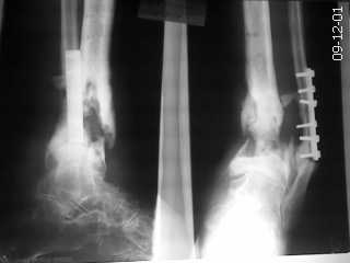 Пациент 35 лет. Оперирован по поводу перелома в ЦРБ. В дальнейшем нагноение-удаление пластины большеберцовой кости. В настоящее время имеется варусная установка голени, укорочение конечности. Имеется рана с гнойным отделяемым. Ходит с помощью костылей. Рассчитывать на серьёзные материалы для лечения смысла нет, т.к. больной неплатежеспособен.