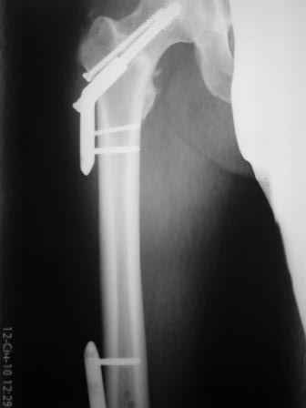 На сегодняшний день наступил перелом пластины, укорочение бедра 2 см. Перелом шейки клинически и рентгенологически сросся. Больной астеничен, немного анемичен. Рентгенограммы прилагаются.