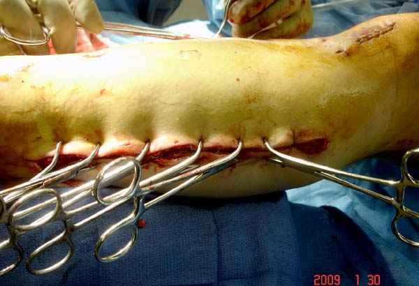 Предпочтительно сначала закрыть медиальную сторонну, а затем латеральную, потому что при невозможности закрытия кожных ран, наружную сторону легко закрыть кожной пластикой.