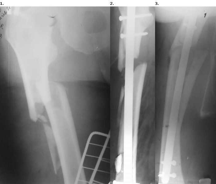 из Доброго времени суток, уважаемые коллеги. Пациент 56 лет поступил в отделение 28.12.09 со свежим переломом в/3 правого бедра. 15.01.10 произведен закрытый БИОС гвоздем Sanatmetal. (d13мм), во время которого произошло раскалывание проксимального и дистального отломков. ЭОПа в больнице нет, для определения локализации направителя пользовались стареньким "Арманом". После заведения гвоздя по проводнику снимки на столе больше не делали, дистальное блокирование оч.быстро с использованием электромагнитной навигации. В послеоперационном периоде выраженные боли и отек. На контрольных рентгенограммах вот такая картина.