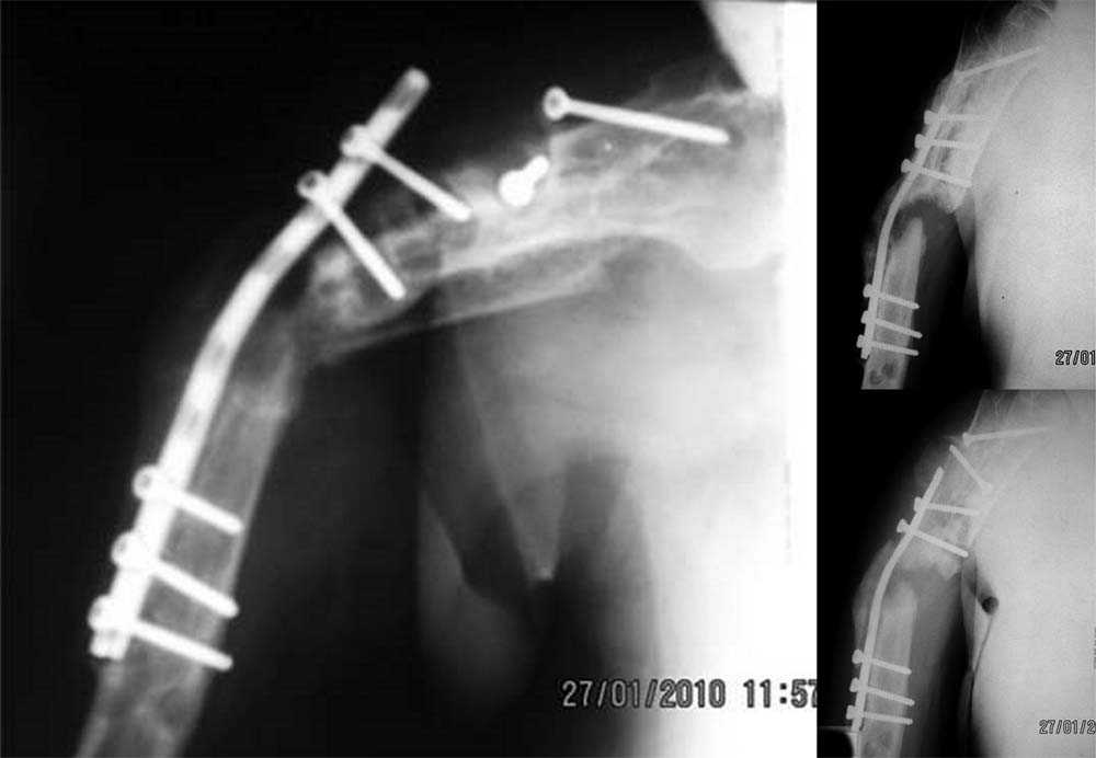 В настоящее время ожидается госпитализация в ортопедическое отделение. Локально: множественные послеоперационные рубцы по всему плечу, состояние их удовлетворительное, признаков воспаления нет. Визуально варусная деформация плеча. Отведение в плечевом суставе до 60 град. В с\з - в\з плеча патологическая подвижность, при усилении деформации пальпаторно определяется верхний конец пластины. Болевой синдром не выражен. В анамнезе после второй операции - нейропатия лучевого нерва. В настоящее время клиники нет. Хотелось бы услышать мнение коллег по данному случаю. С уважением. В. Шевченко, г. Хабаровск.