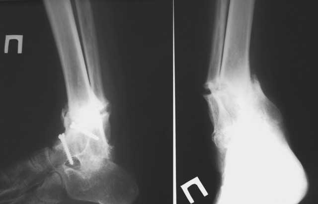 Женя, сегодня через рассылку пришёл данный случай с *правильными* рентгенограммами. Почему так случилось? Скорее всего (по иному сложно объяснить) деформация с перестройкой кости развилась вследствие не совсем правильной установки стопы в бывшем голеностопном суставе. При артродезировании мы стараемся сместить таранную кость чуть кзади в положении лёгкой функциональной наружной ротации и вальгусом примерно в пять градусов. Отказ от выполнения данных рекомендаций, особенно, в сочетании с избыточным подошвенным сгибением стопы приводит к избыточной нагрузке на средний отдел последней. На фоне ревматоидного артрита и отсутствия должной эластичности среднего и переднего отдела стопы с механической точки зрения возникшая перестройка кости понятна и объяснима.